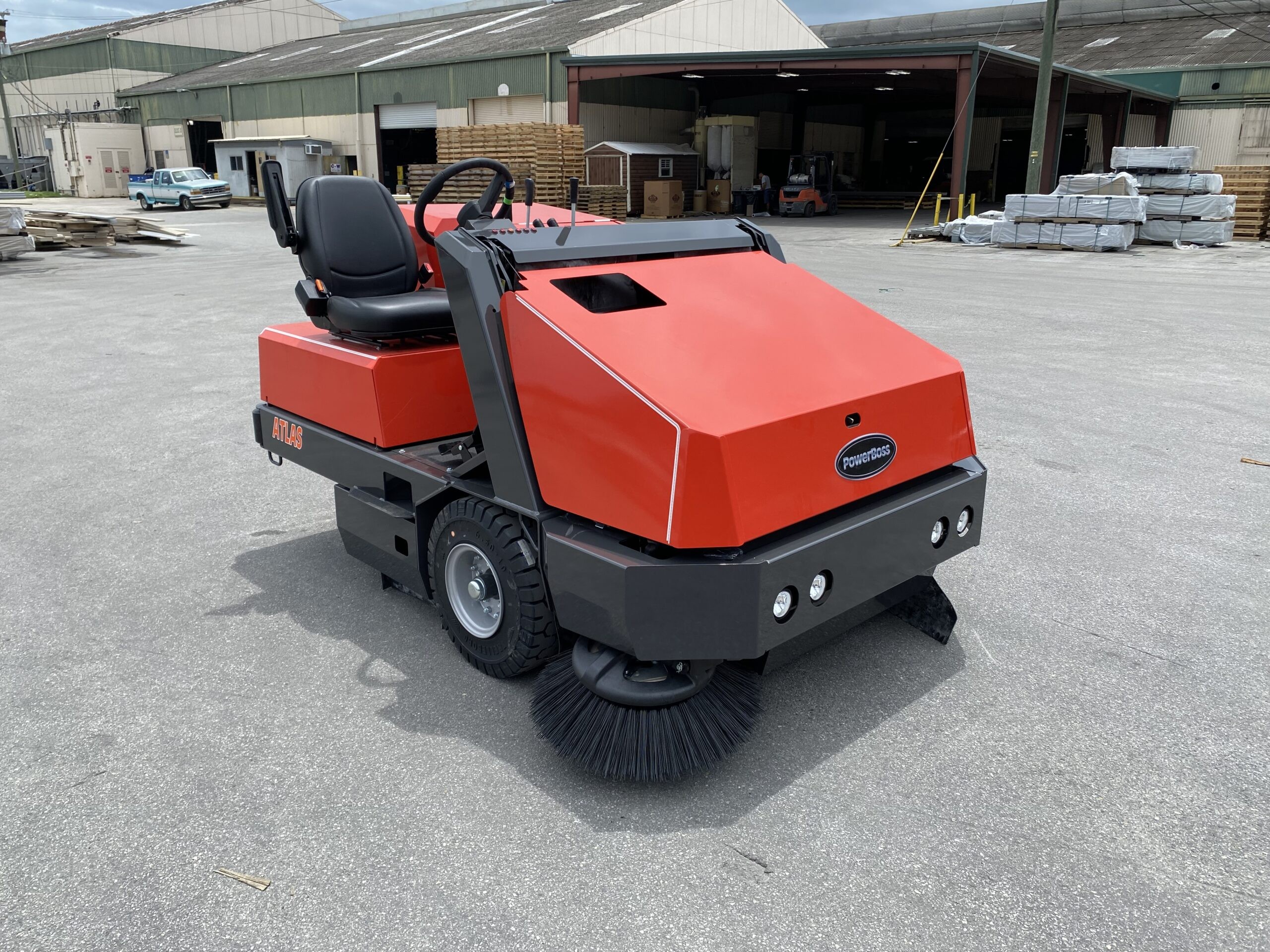 The PowerBoss Atlas Rider Sweeper is a durable, high-performance machine designed for efficient cleaning in demanding industrial environments. Its expansive sweeping path and substantial hopper capacity make it ideal for large-scale facilities requiring thorough debris removal.